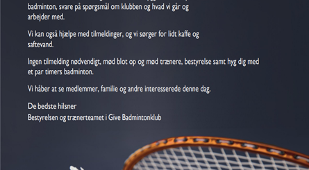 Lørdag den 5. oktober afholder vi Familiedag og Åbent Hus i Give Badmintonklub. Vi håber at se både nuværende medlemmer og evt. nye interesserede medlemmer, til et par hyggelige timer i hallen. Se mere på billedet i opslaget 🏸🏸