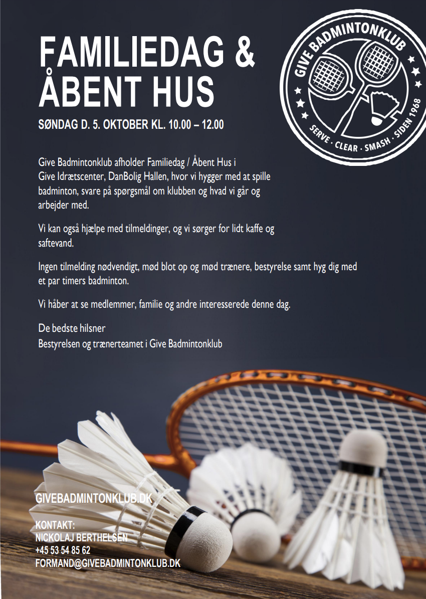 Lørdag den 5. oktober afholder vi Familiedag og Åbent Hus i Give Badmintonklub. Vi håber at se både nuværende medlemmer og evt. nye interesserede medlemmer, til et par hyggelige timer i hallen. Se mere på billedet i opslaget 🏸🏸